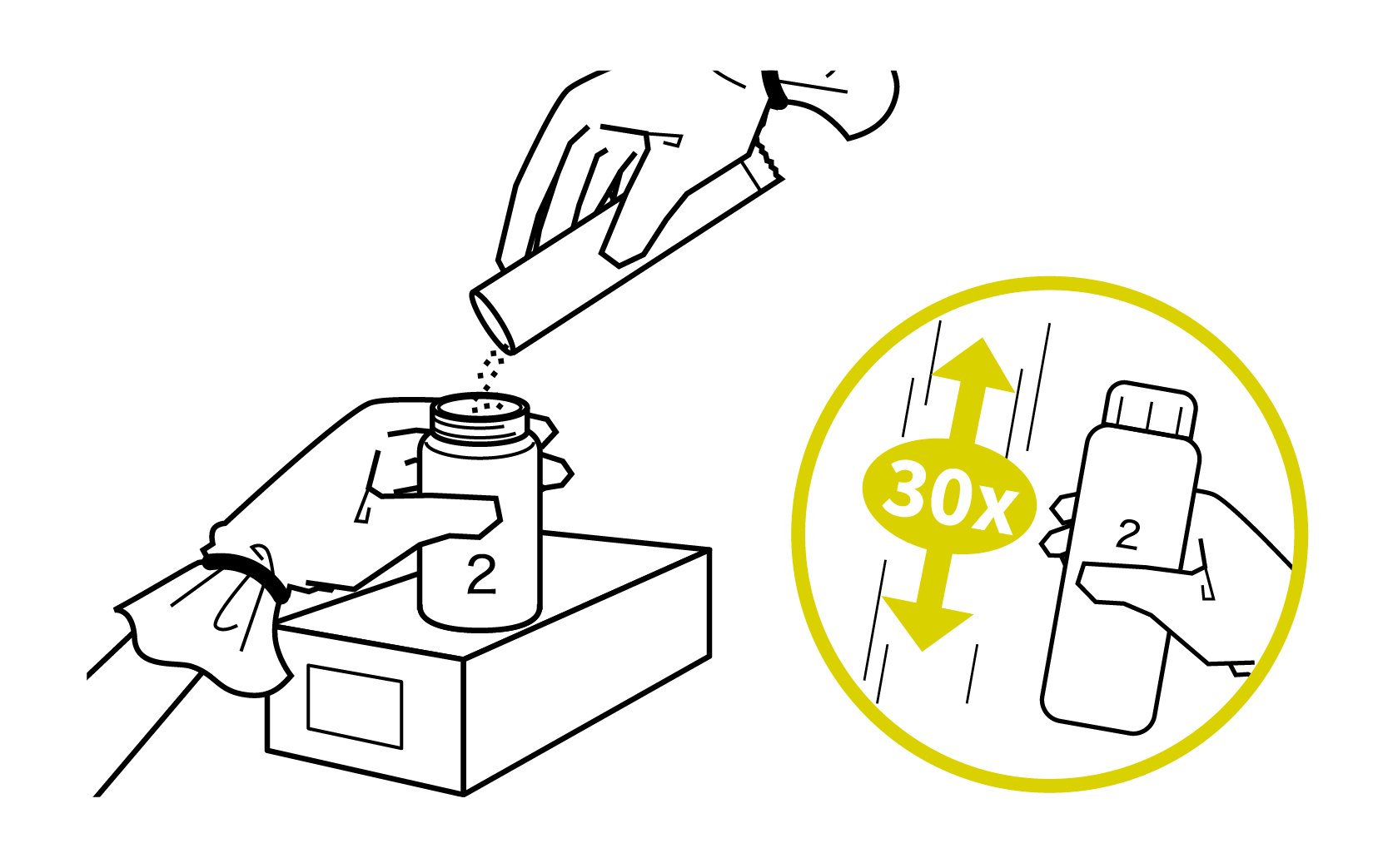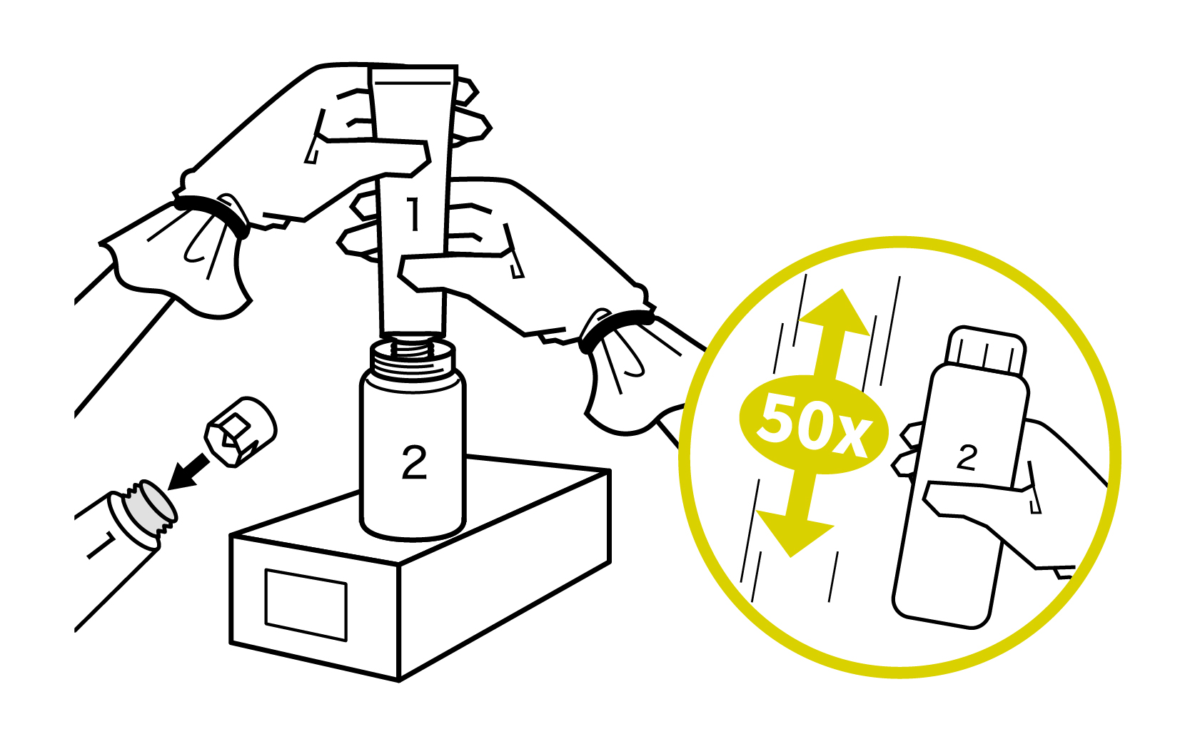 Tighten the white cap and strongly shake the bottle up and down about 50 times (about 30 seconds). Do not leave the product with the white cap on. Gas may build up in the container causing it to burst and the mixture to overflow.