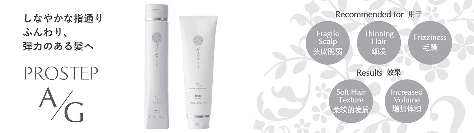 Prostep hair care addresses hair and scalp concerns. The range focuses on the continued hair care at home with color care function that reduces damage and prevents color fading. In addition, Prostep hair care also manages the deterioration of hair quality and scalp concerns caused by aging.